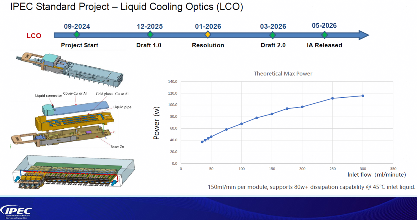 • Liquid Cooling Optics (LCO):IPEC最新立项的原生液冷光学技术,以应对AI光互联模块更高数据速率和散热效率的需求。